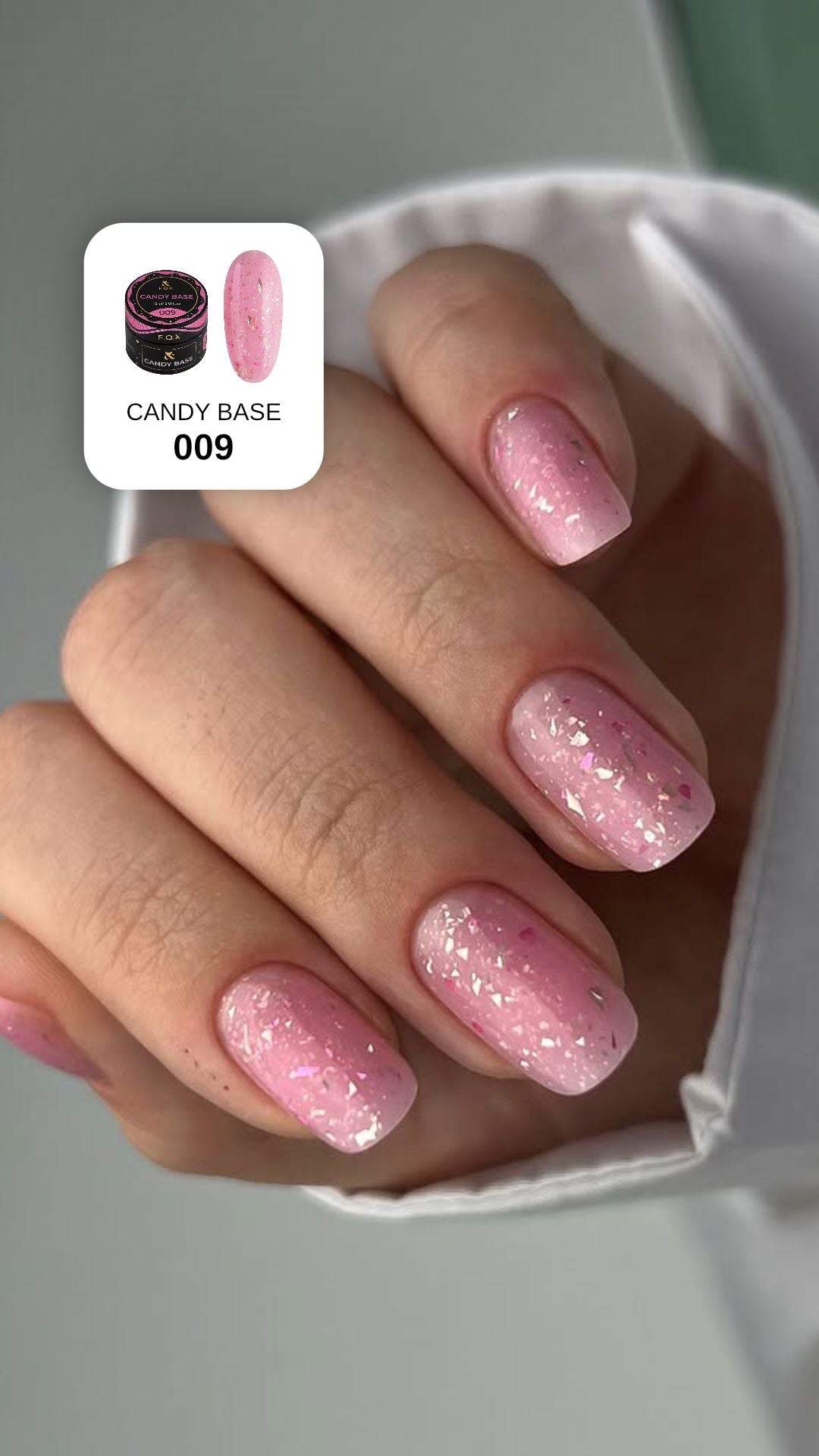 F.O.X Candy Base 009 from the Candy Base collection offers a sheer pastel tone enhanced with colorful foil and glitter for a soft, luminous sparkle. The thin, flexible foil stays evenly suspended in the gel, spreads smoothly, and never adds bulk, making application easy and precise.