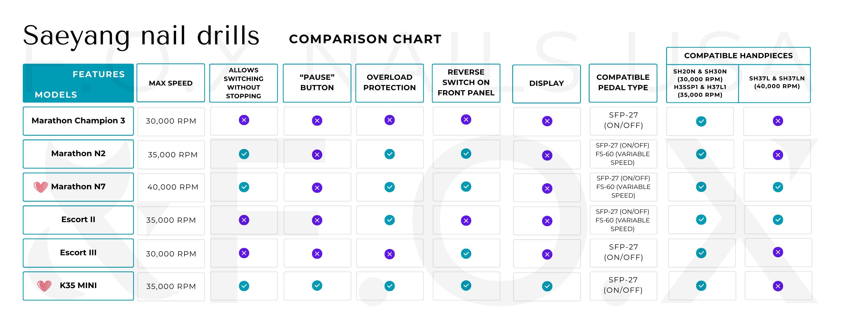 • The Mini K35 is the only model in Saeyang’s nail drill lineup that supports dual voltage: 110V and 220V. This is why it comes with a European plug and an adapter for American outlets.