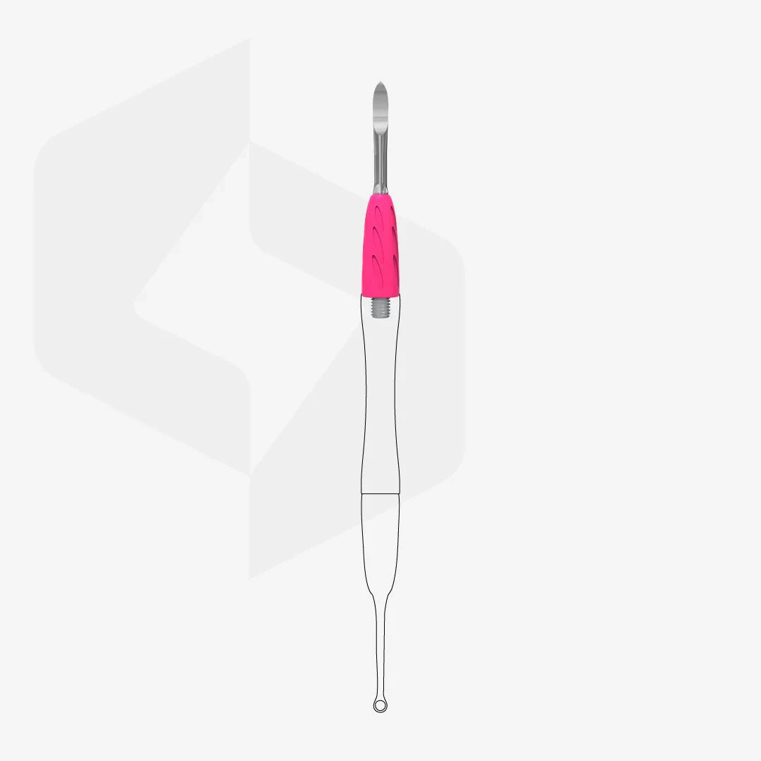 The “pusher + cleaner” is designed for professional manicure and pedicure. The cleaner side removes dry skin from the nail plate, lateral nail folds, and the free edge, while its narrowed, slightly curved tip ensures precision and comfort.