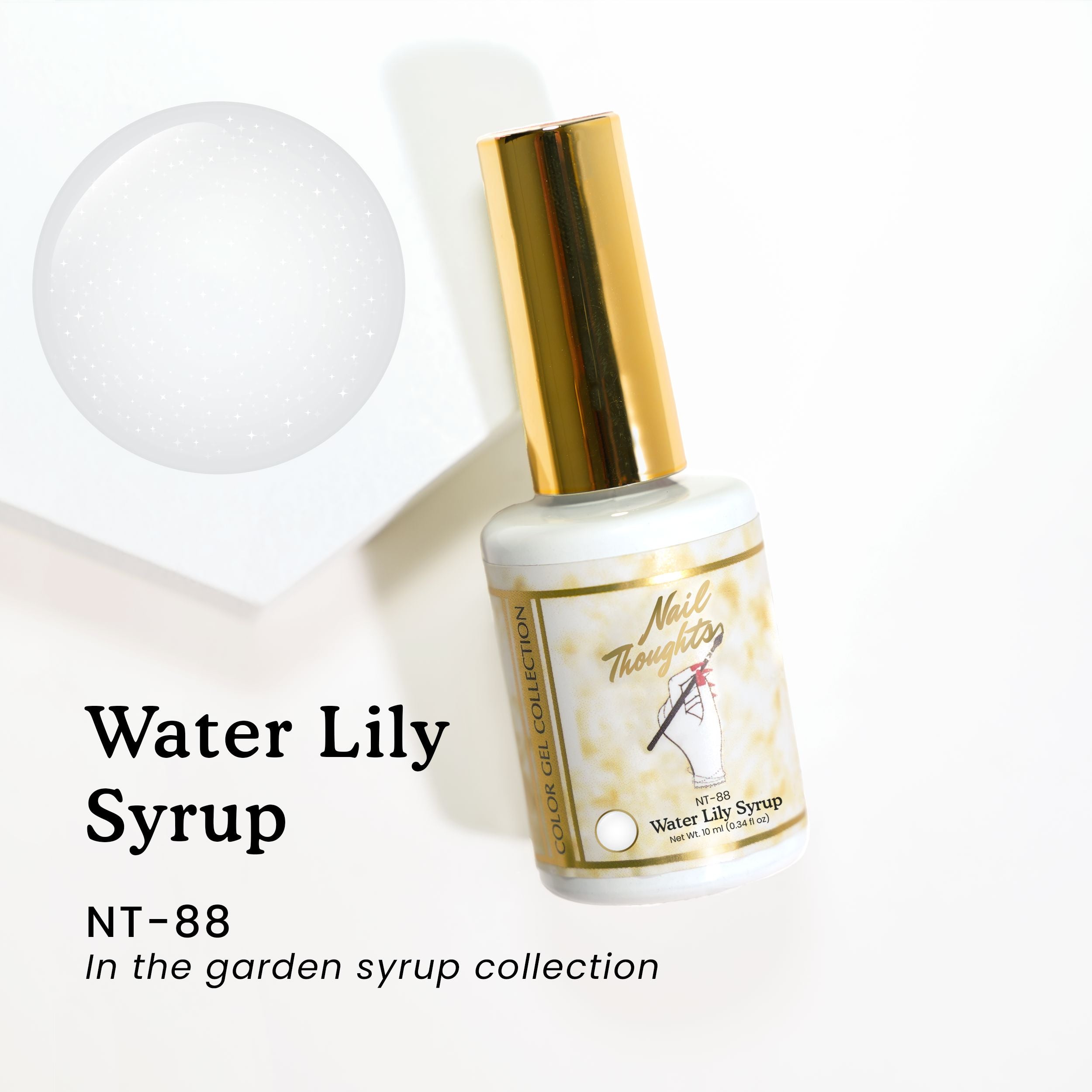 Nail Thoughts NT-88 Water Lily Syrup is a milky sheer white gel infused with delicate silver glitter. Perfect for adding a subtle sparkle to clean manicures or layering for soft, radiant nail art.