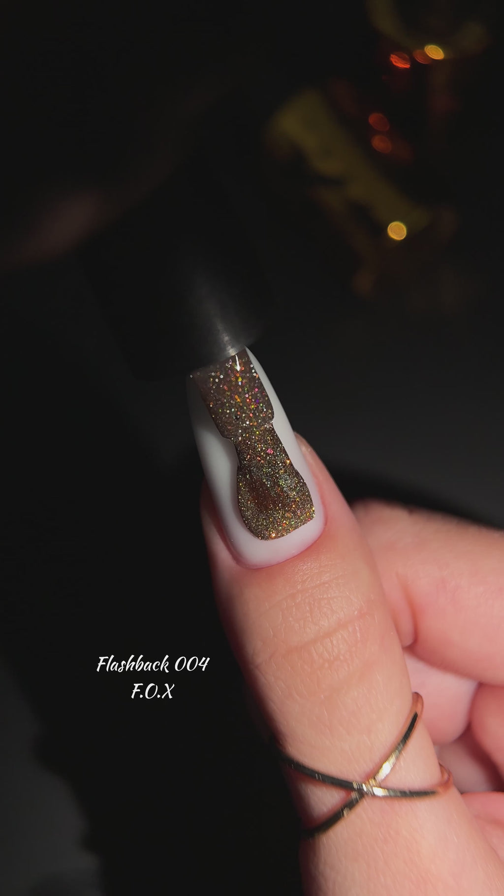 F.O.X Flashback 004 is a warm gold duochrome with visible shifts of rose-copper and a subtle green tone. Under flash, the multichrome effect becomes bold and dimensional. Ideal for statement nails, accents, and luxury designs.