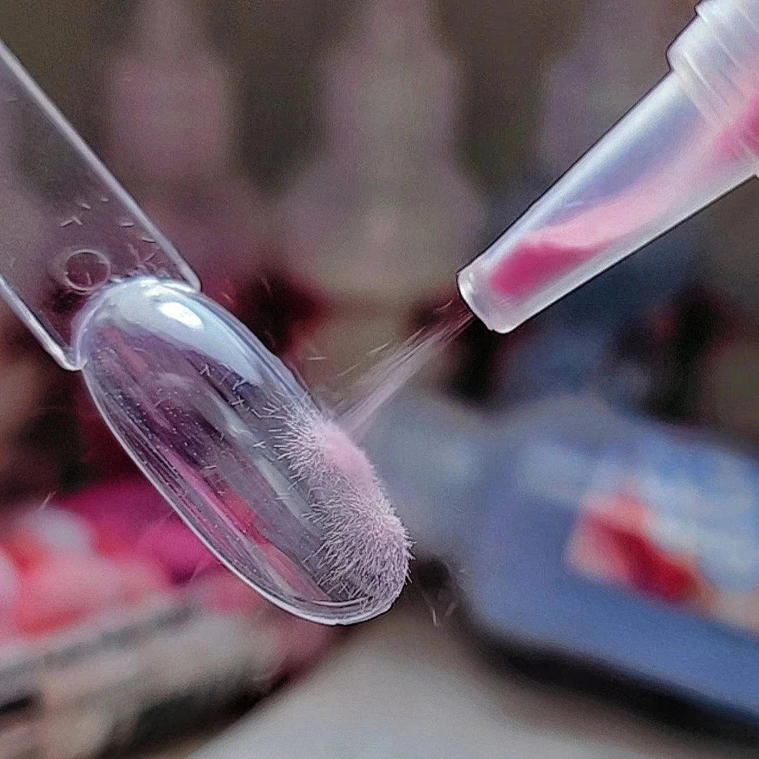 2. Squeeze bottle to puff out Pushu Pushu fibers. Ensure nozzle is perpendicular to the nail.