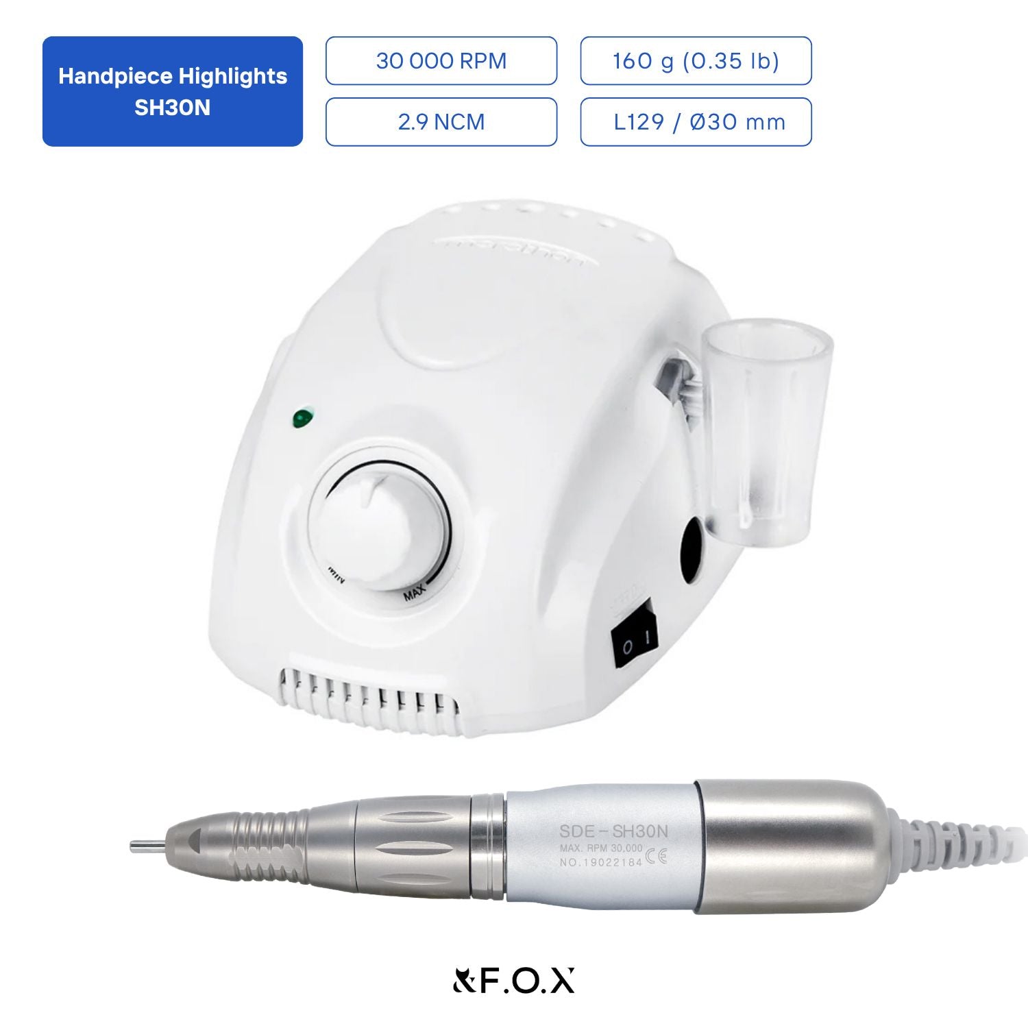 - Max speed: 30,000 RPM.
