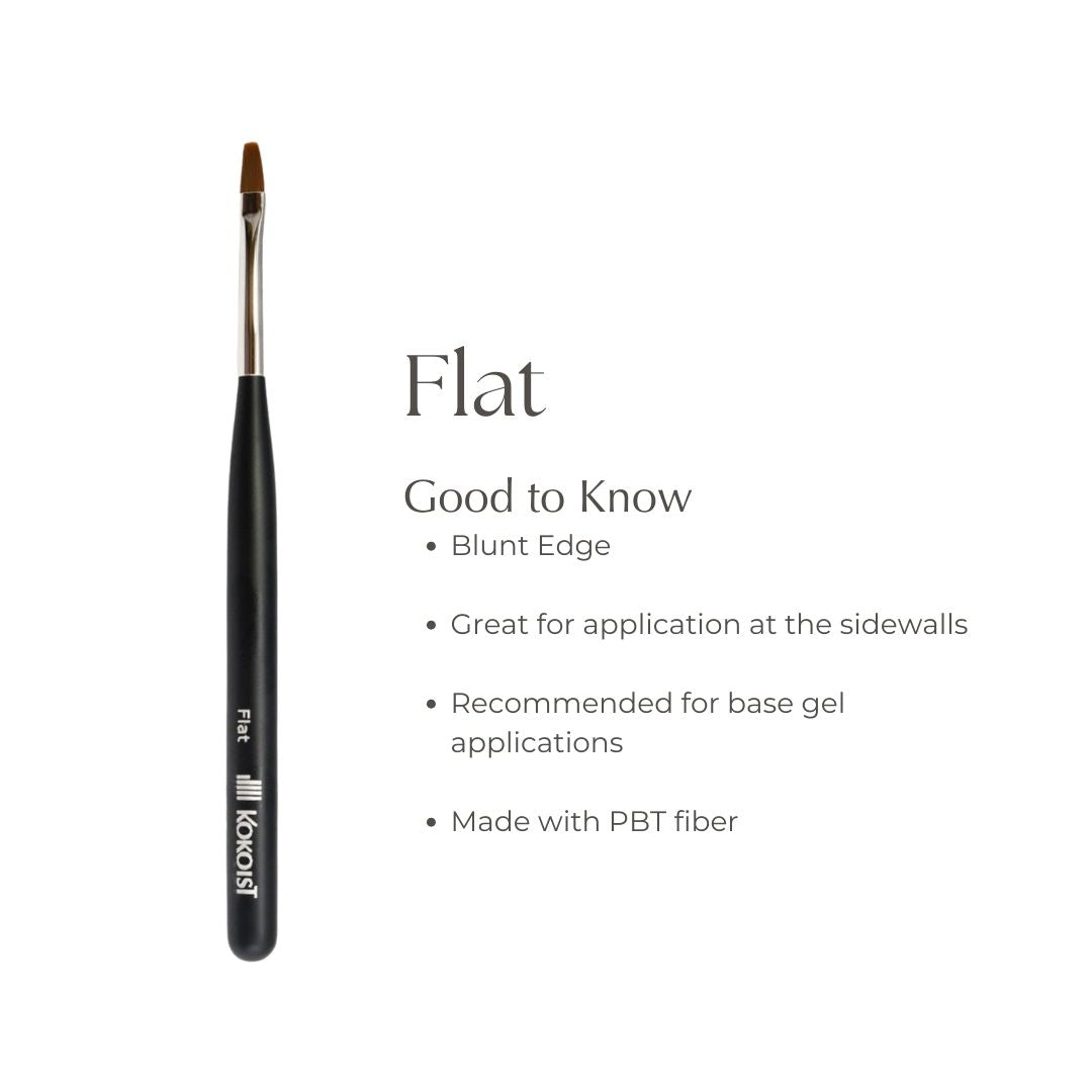 The Flat Brush is recommended for base gel applications. The blunt edge of this brush makes it great for application at the sidewalls. Made of PBT fiber.