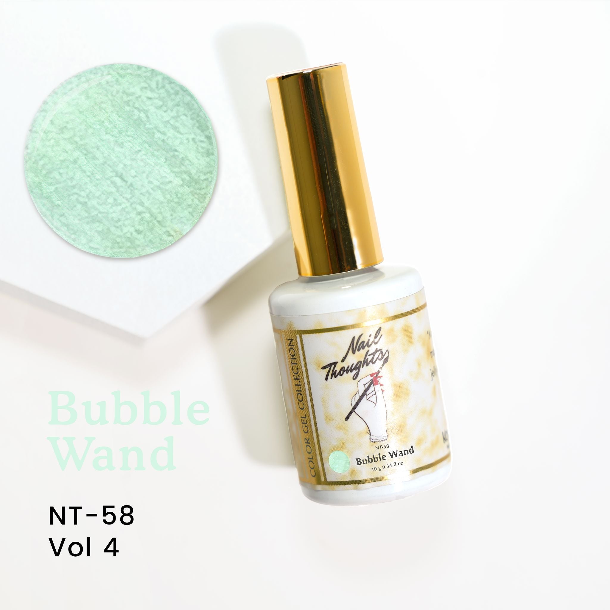 "A frosty, iridescent green shimmer gel. Bubble Wand gel color is a very sweet slightly green toned shimmer gel. It's sheer enough to layer on top of colors, but opaque enough to wear as a solid shimmer gel colors! So if you are ready to enter your magical mermaid era, Bubble Wand is for you." - Katie