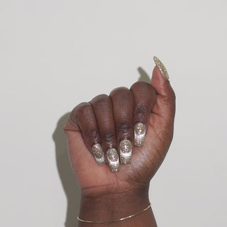 A yellow gold magnet gel infused with holographic flash glitter for a clean, refined glow.
