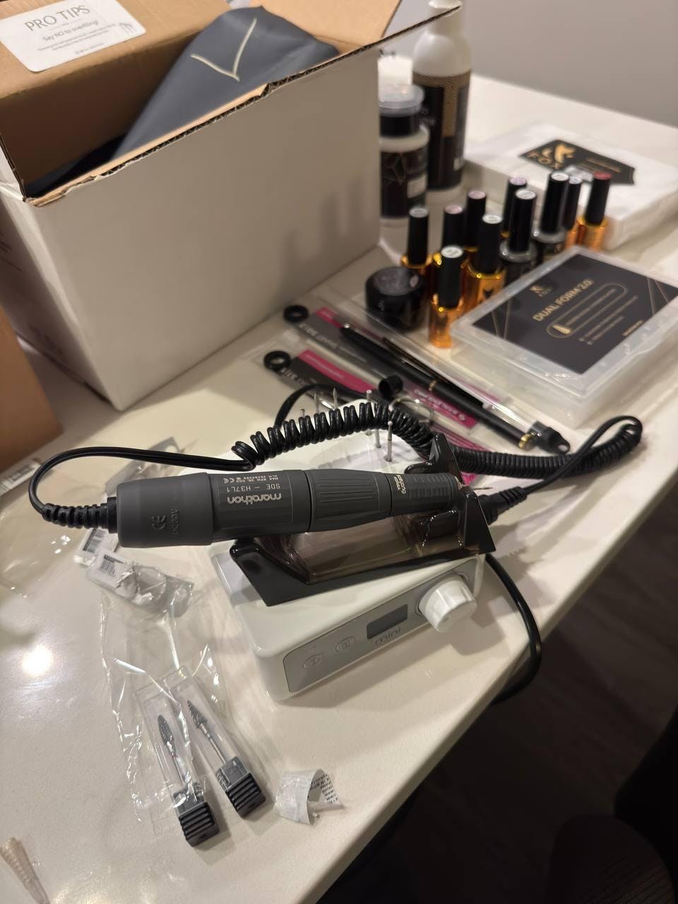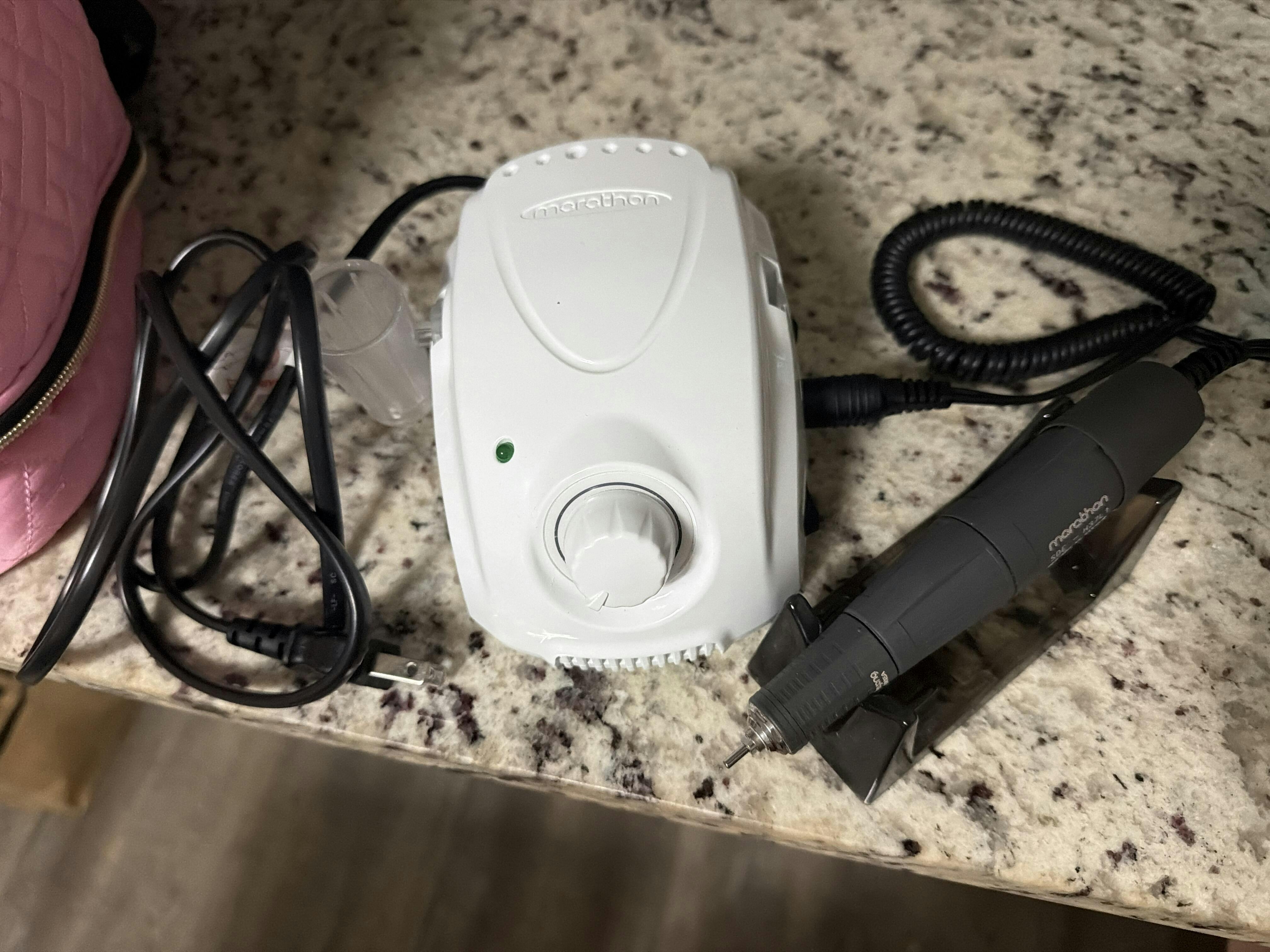 A good manicure machine for work, it is quiet, the nail drill handle is comfortable, not too heavy and not too light. It doesn’t take up much space. The cord is long enough to easily plug into a wall outlet.