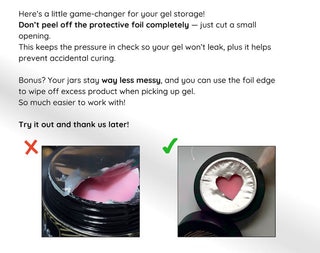 Pro Tips: Keep gel jars clean by cutting a small opening in the foil instead of peeling it off — it prevents leaks and accidental curing. Bonus: use the foil edge to wipe off excess product for mess-free application!
