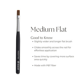 The Medium Flat Brush is slightly wider and longer than the Flat Brush, giving a smooth and effortless application. This brush can save time as it covers more surface area. Made of PBT fiber.