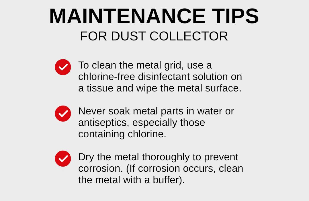 13. To clean the metal grid, use a chlorine-free or acid-free disinfectant solution on a tissue and gently wipe the metal body of the dust collector.