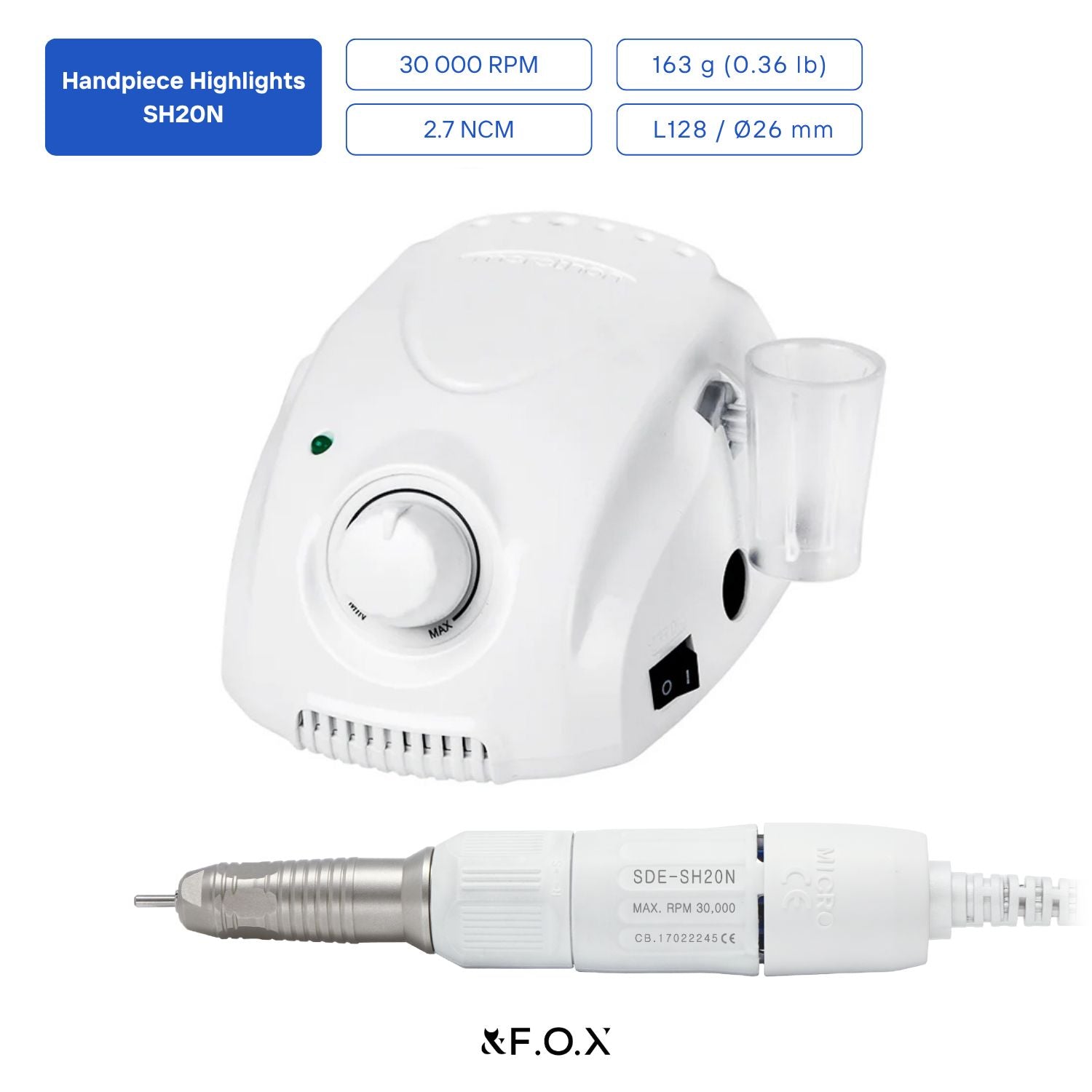 SH2ON Handpiece: Popular and ultra-light, ideal for detailed work. Max speed: 30,000 RPM, torque: 2.7 Nm.